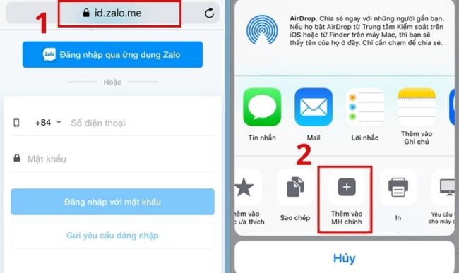 Bước 2: Mở trình duyệt Safari lên sau đó vào đường link id.zalo.me. Đăng nhập Zalo nick thứ 2 của mình. Chọn biểu tượng chia sẻ sau đó chọn Thêm vào MH chính.