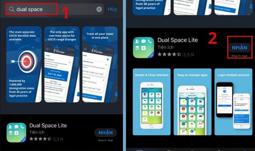 Bước 1: Truy cập vào AppStore sau đó tìm kiếm và chọn ứng dụng Dual Space. Chọn nút Nhận để tải ứng dụng về.