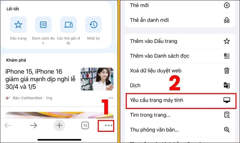 Bước 2: Nhấn vào dấu 3 chấm ở góc cuối màn hình, chọn Yêu cầu trang máy tính.